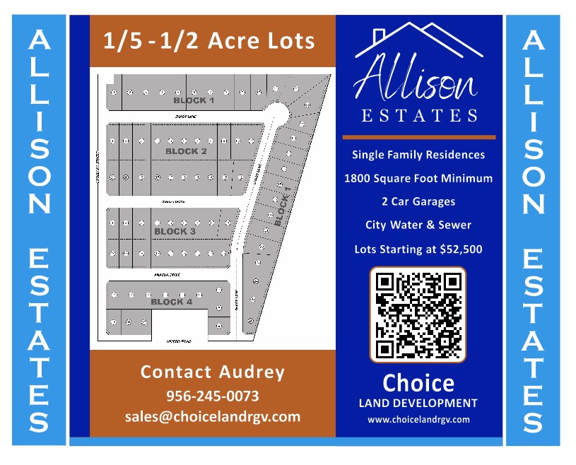 Allison Estates is a premier residential subdivision in the city of Harlingen, TX featuring 77 beautifully designed lots. We are conveniently located near schools, retail centers, and Expressway 77.